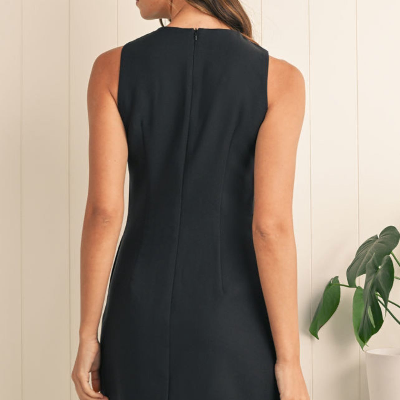 The Grace Dress features a black bow front and high waist, exuding a preppy and sophisticated charm. Its timeless black color adds an elegant touch, suitable for any occasion. The sleeveless, round neck design creates a sleek and modern silhouette, while the bow front accent adds a playful touch.