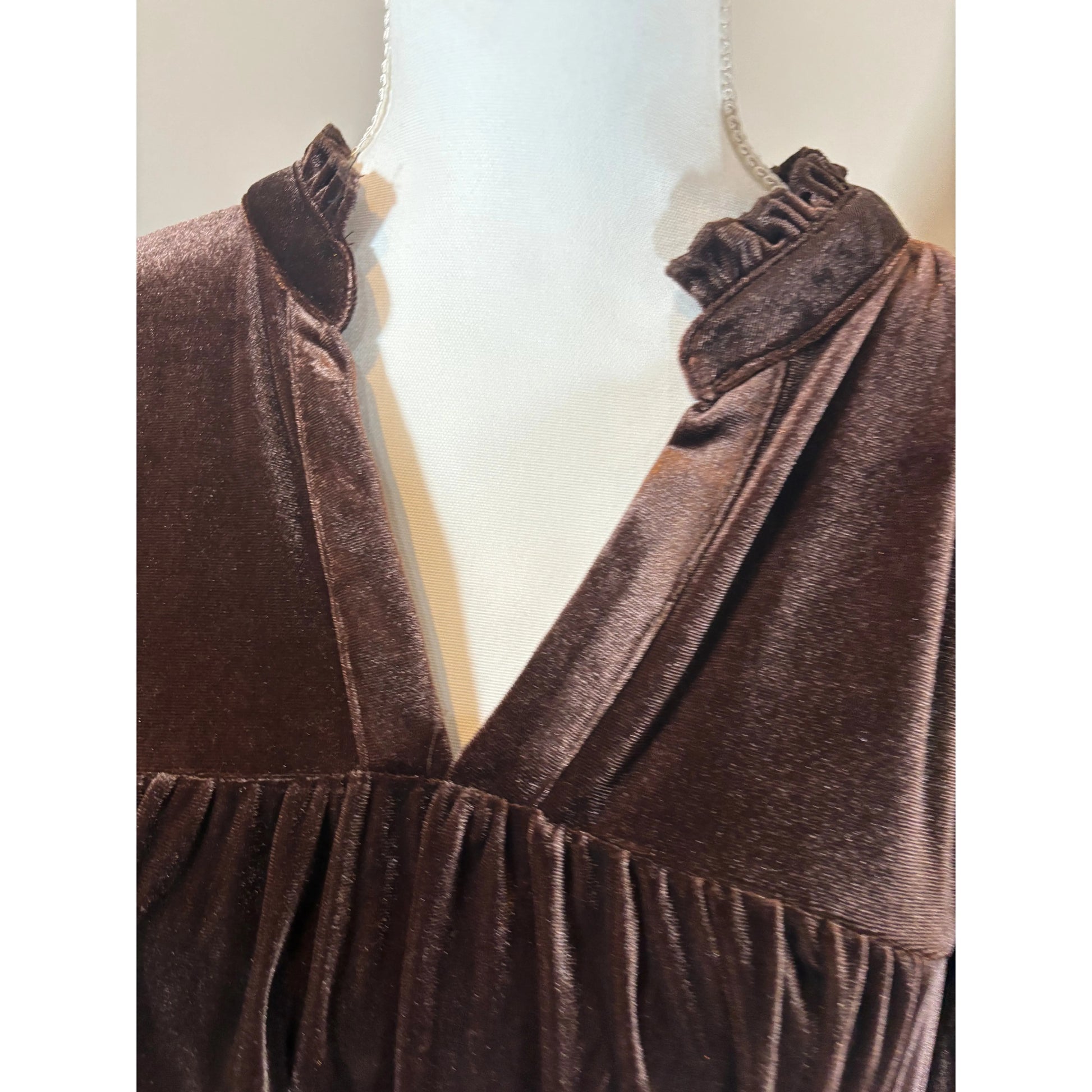 Our Curvy Velvet Flora Brown Top features intricately embroidered bubble sleeves and a V-neckline highlighted by delicate ruffle accents. Its fully lined sleeves ensure comfort while preserving their shape. This elegant piece looks stunning when matched with black slacks or similar attire. Also available in navy and black!