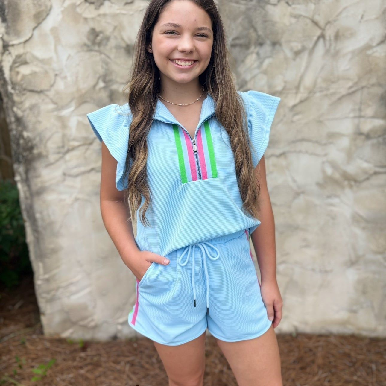 Eden Set (Blue) offers both comfort and style, making it perfect for casual outings or lounging at home. The vibrant hue adds a fun pop of color to any wardrobe, while the flutter sleeves and drawstring waist provide a flattering and adjustable fit. With its unique neckline detail, this set stands out with its playful yet sophisticated design, ideal for those looking to make a statement. The set also comes in pink, so why not get both and add some versatility to your wardrobe? You won't regret it!