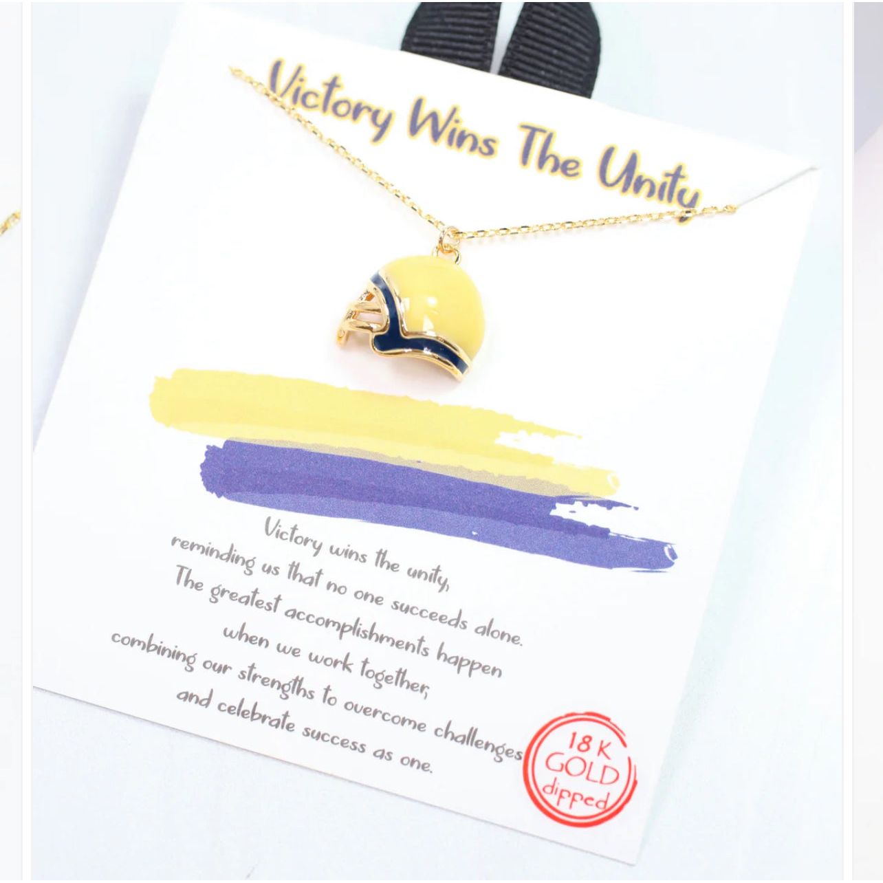 This Navy and Gold Enamel Helmet Necklace features a colorful helmet pendant with gold trim on a gold-dipped chain. It's a stylish and easy way to show your team pride for any occasion.
