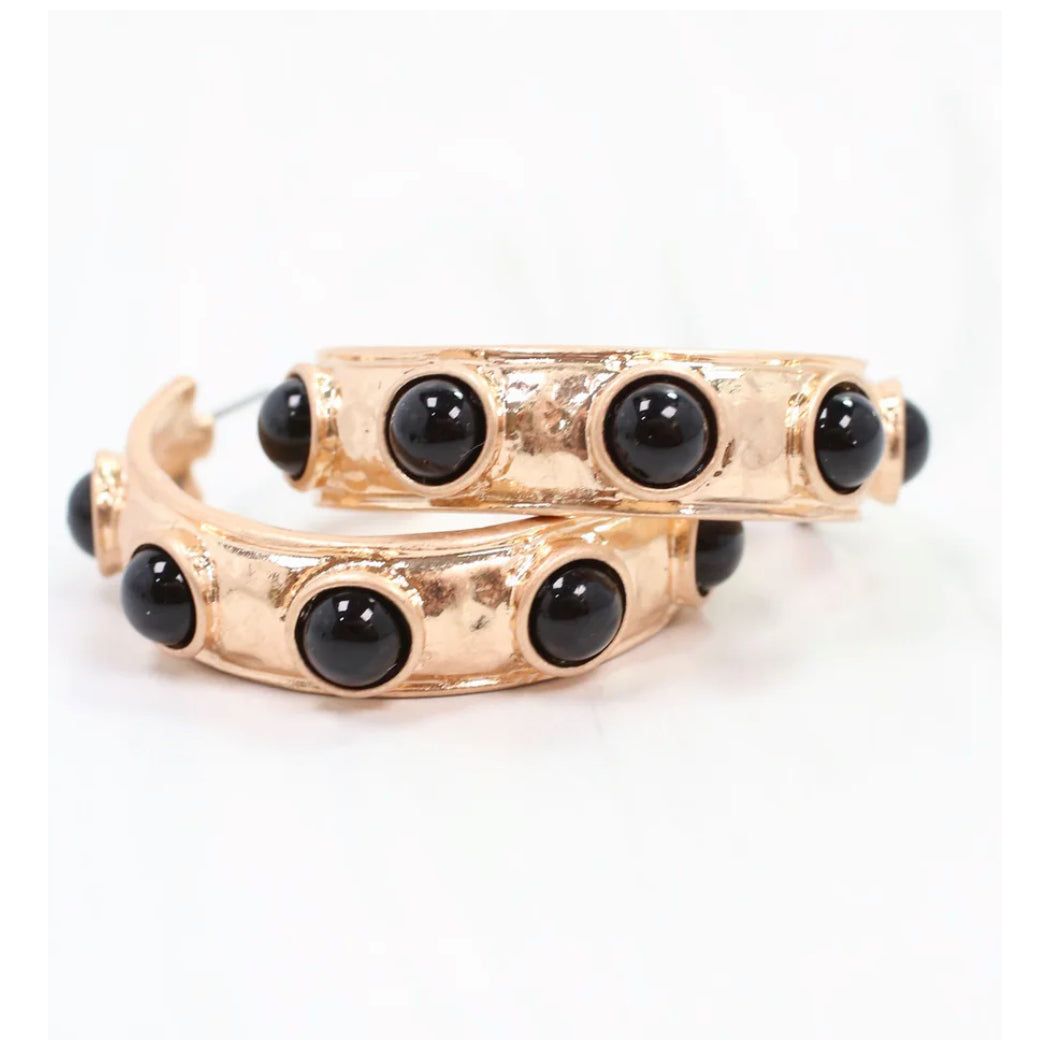 Elevate your jewelry collection with the Frazee Hoop Black earring, expertly crafted to blend classic elegance with a playful twist. This piece features round black acrylic stones set on a hammered gold hoop, creating a striking contrast that enhances any outfit. Its refined design makes it ideal for layering with other gold accessories, offering versatility and a bold statement in one. Perfect for those who appreciate sophisticated yet distinctive jewelry.