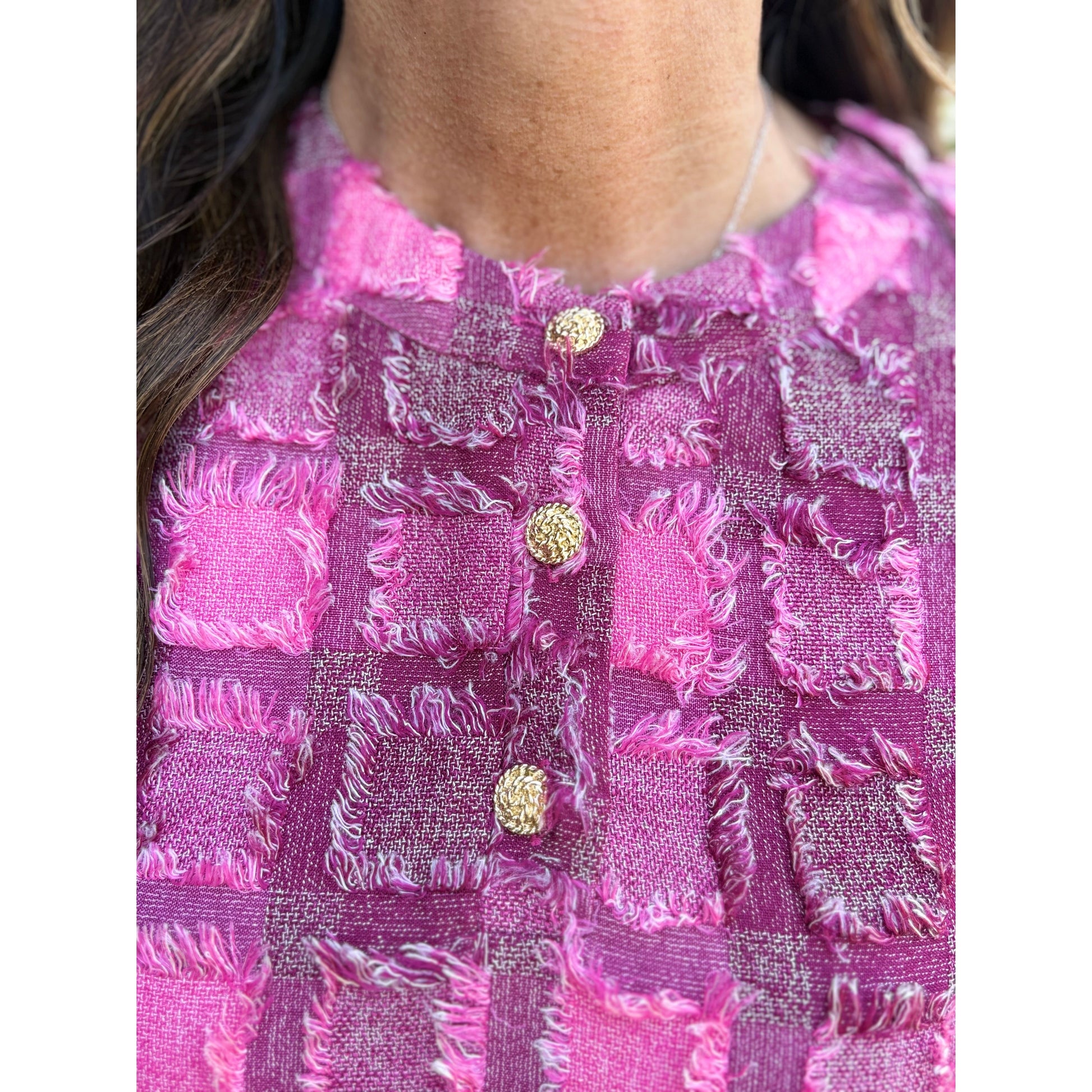 The Julia Fringe Plaid Mini Dress features a sophisticated textured fray plaid fabric that adds depth and character to its design. Its puffed short sleeves and classic round neckline create a balanced silhouette, enhanced by a traditional three gold button closure at the neckline, blending elegance with a subtle vintage charm. Fully lined, this dress ensures comfort and a smooth fit against the skin, while the functional front pockets add practicality without compromising style. Perfect for day-to-night wear, this mini dress offers a refined yet relaxed look suitable for various occasions.