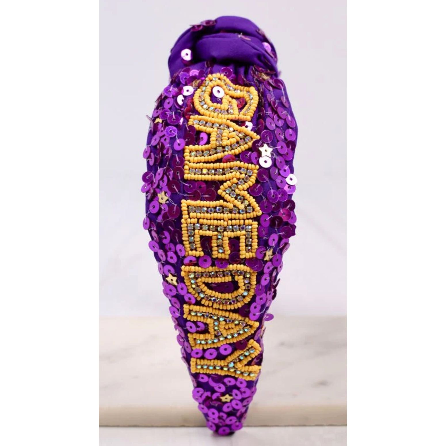 Complete your game day look with this awesome headband! It is features a fabric covered in sequins and stars for a fun look. It has "GAMEDAY" in a beaded outline with CZ filled accents.