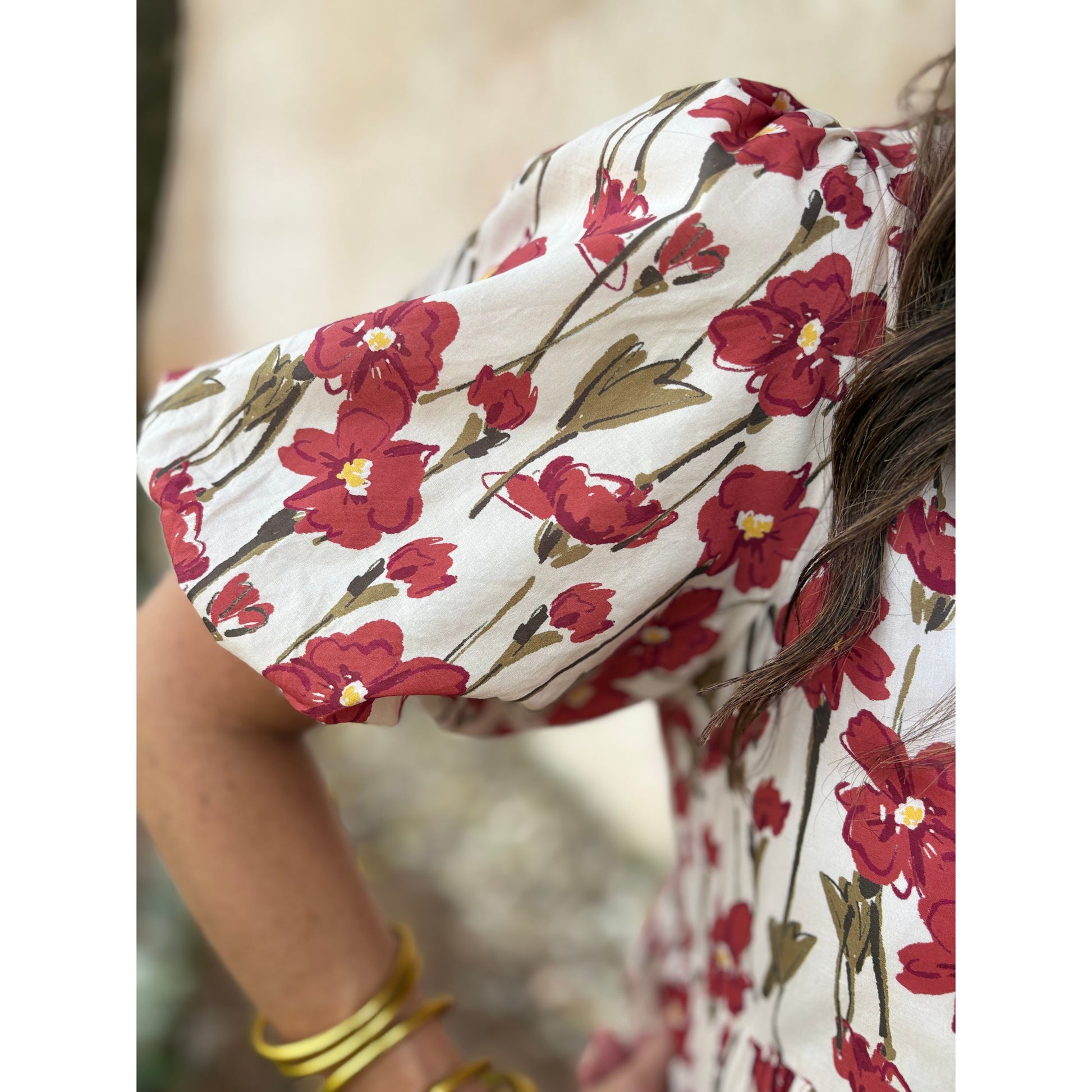 Our Harper Dress is a lightweight woven mini dress showcases a floral print with short bubble sleeves and a tiered silhouette. It includes a multicolor band detail for accent, side pockets for practicality, and a lining for opacity. Designed as a pullover, it offers both style and comfort.