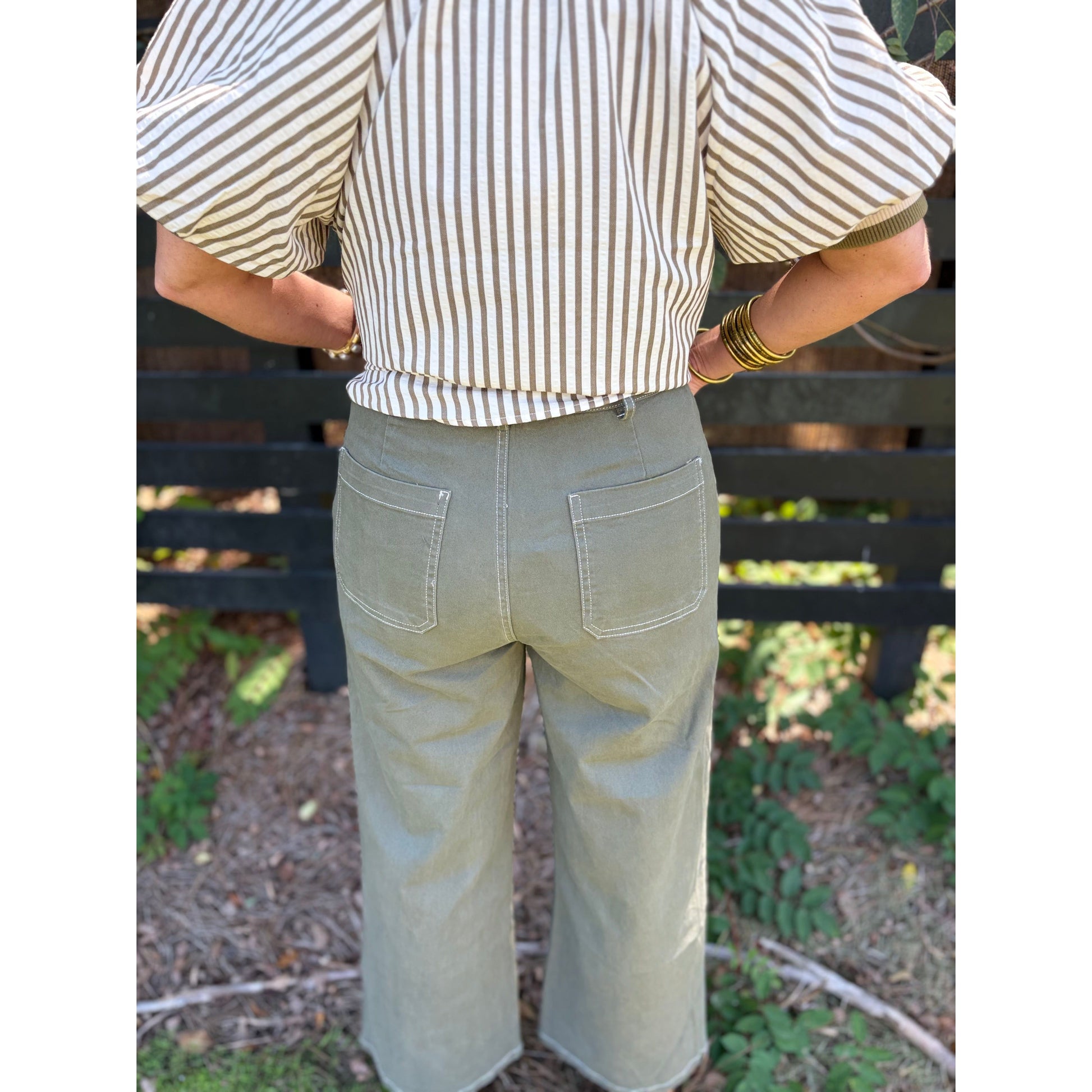 Our Jade Pants feature a solid high-rise design with a button fly and zipper closure, highlighted by visible stitch detailing. They include patch pockets on both the front and back, are unlined, lightweight, and crafted from non-sheer fabric. They are causal, comfortable and easy to laundry. A perfect match with our Audrey Top!
