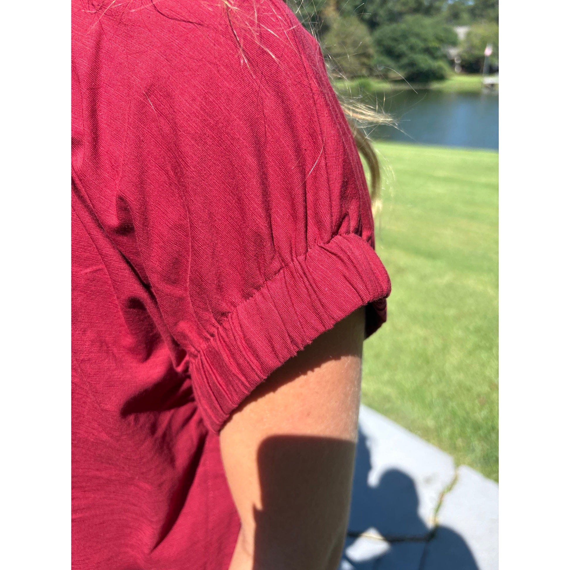The Karly Top in Maroon offers a relaxed yet refined silhouette, featuring elastic sleeve details that add subtle structure and comfort. Crafted from lightweight knit fabric, this top drapes effortlessly, making it an ideal layering piece or standalone statement. Also available in Black and Lavender. Perfectly paired with our Game Day Skort.