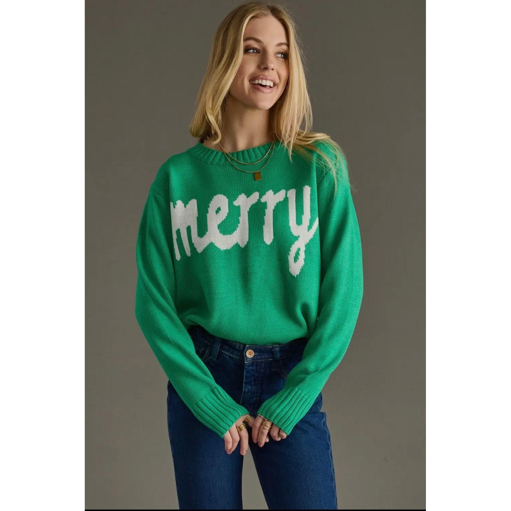 This Kelly Green Sweater features the word "Merry" prominently displayed in white text across the front. It is the perfect sweater for the holidays! Pair it with our Demi Dark Denim Jeans and you will be the best dressed! Our Merry Sweater also comes in Red and Mint Green.