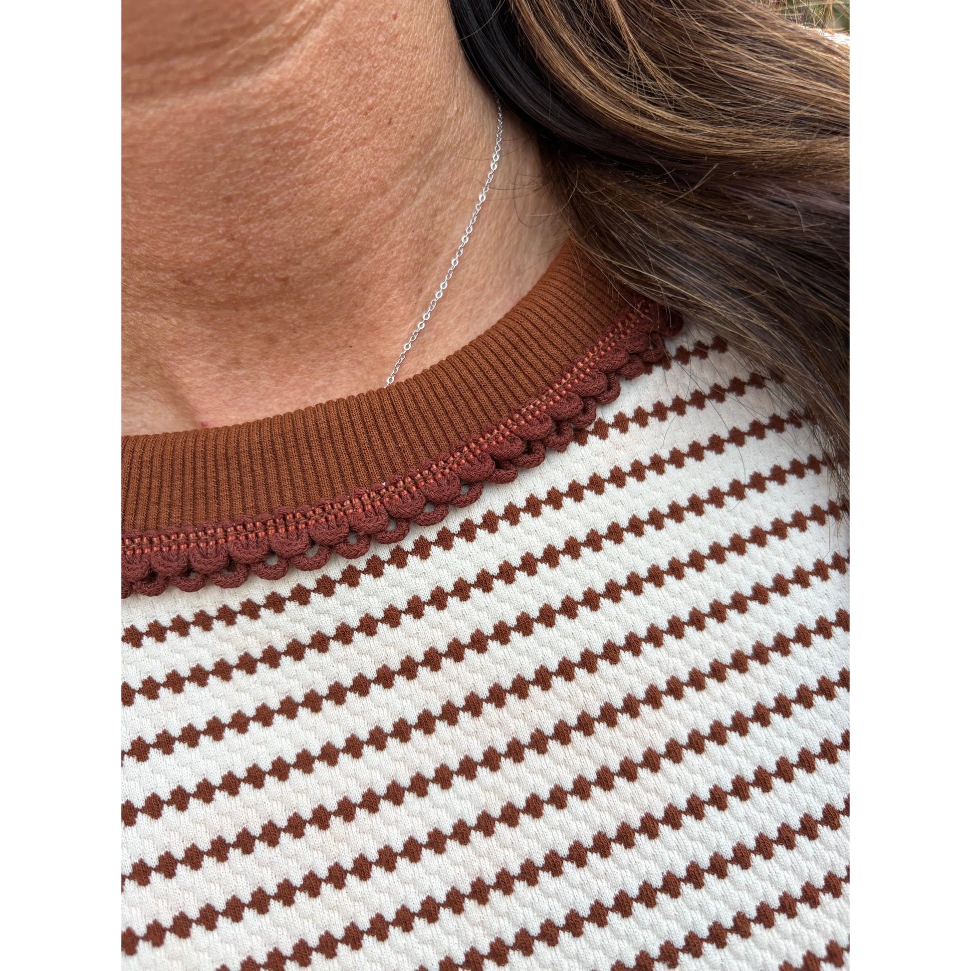 The Leah Top is a striped textured knit tee featuring a scalloped lace trim along the edges. This modern shirt design includes a ribbed round neckline, scallop lace detailing throughout, double ruffle short sleeves, and a relaxed silhouette for comfortable wear. Simple and comfortable enough to wear to run errands or attend a game and dressy enough to pair with brown pants and wear to work! This is a must have this fall!!