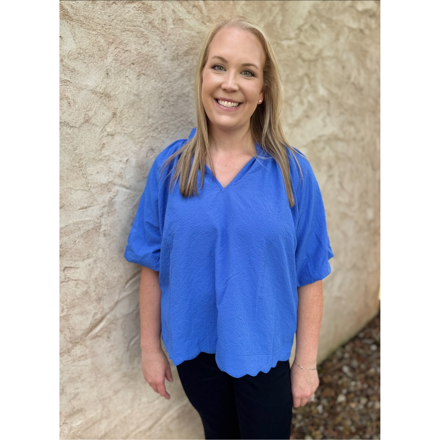 The Curvy Lucy Seersucker Blouse combines classic texture with modern design for a refined look. Crafted from lightweight seersucker fabric, it offers breathable comfort ideal for warmer days. The blouse features elegantly puffed bubble sleeves that add volume and a touch of sophistication, while the scalloped hemline provides a delicate, feminine finish. Perfect for both casual outings and polished office wear, this blouse pairs effortlessly with tailored pants or skirts, making it a versatile addition to your wardrobe. Experience timeless style with a contemporary edge in the Lucy Seersucker Blouse.