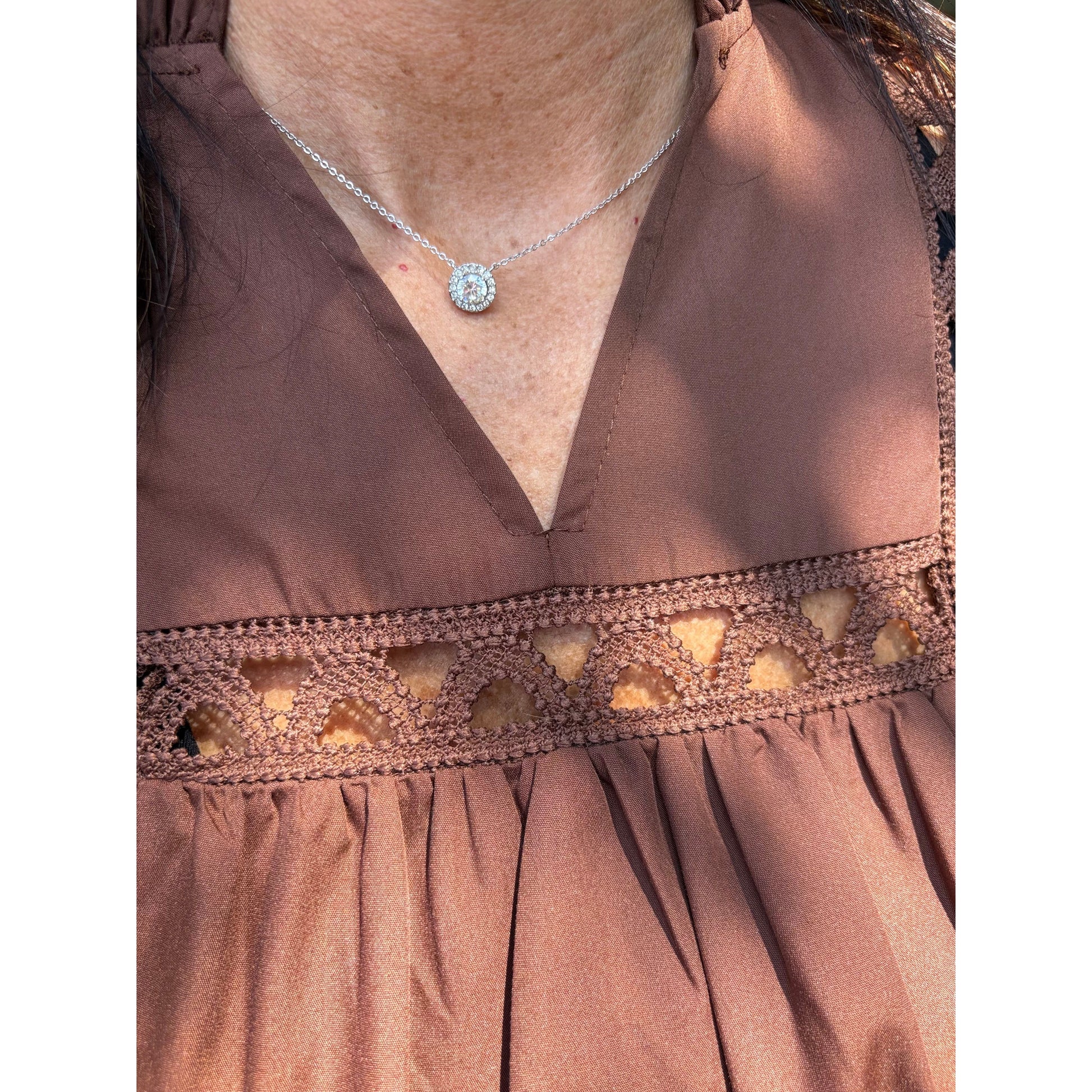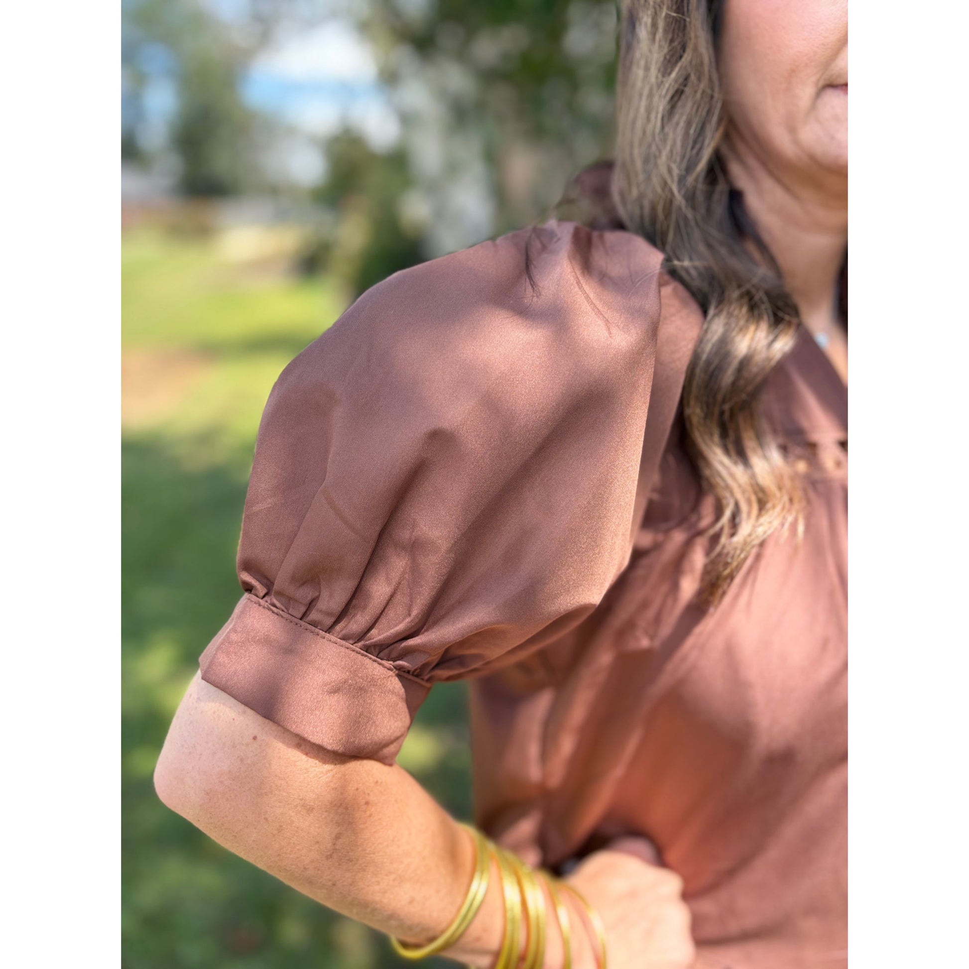 The Natalie Mini Dress features a solid cuff band and elbow-length sleeves with a ruffled hem. It includes scalloped trim detailing along the yoke and skirt, side pockets for convenience, and a fully lined woven fabric that is lightweight and opaque.