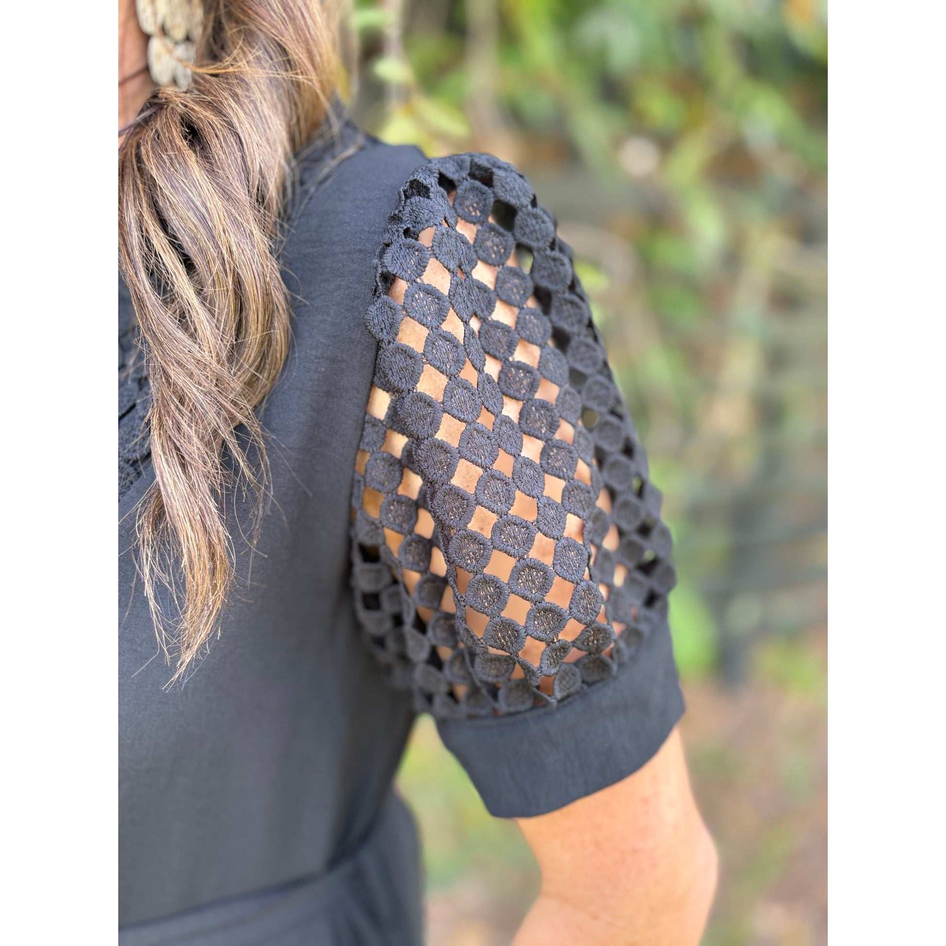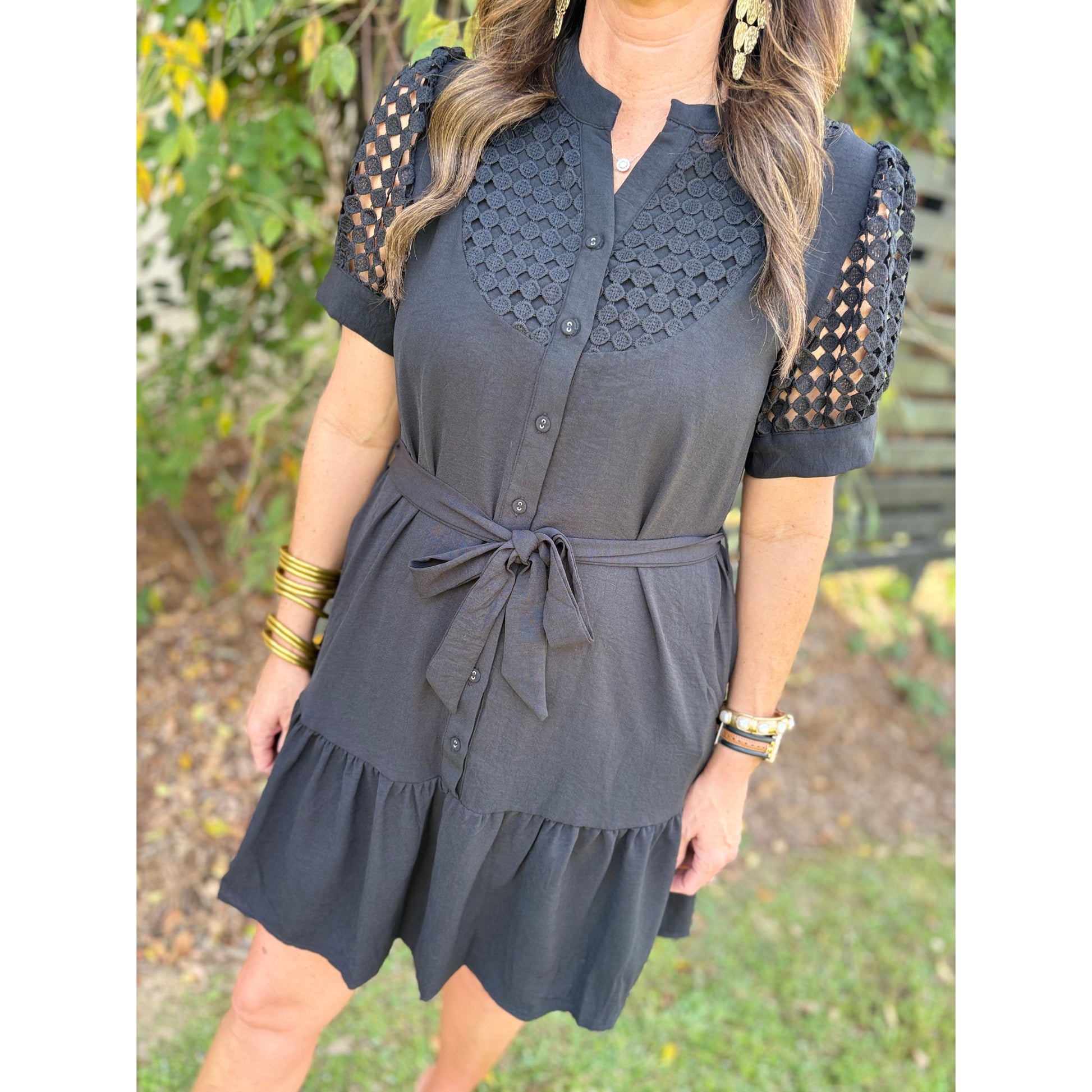The Reagan Mini Dress combines a delicate crochet lace design with short sleeves for a comfortable, stylish fit. It features a front tie and button-down closure for easy wear, plus handy pockets to keep essentials close. Perfect for both casual and dressy occasions, this dress offers timeless elegance with practical details.