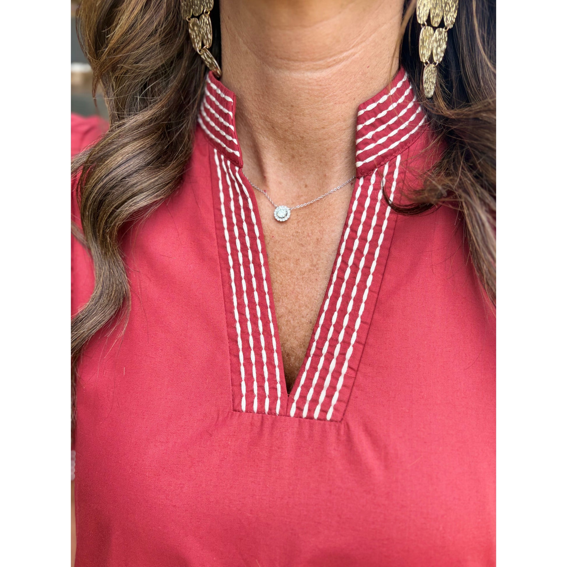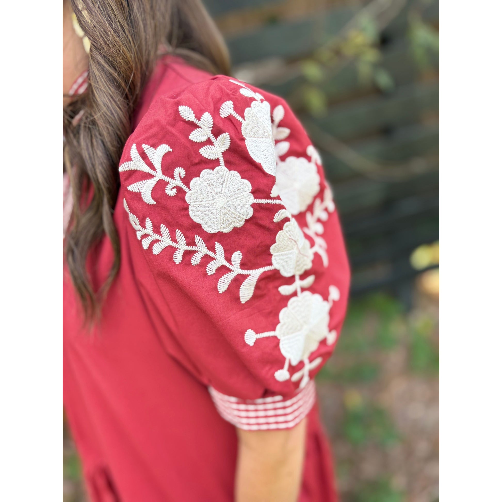 The Scarlet Dress is a comfortable mini dress featuring short puff sleeves, floral embroidery, and striped trim. Made from lightweight woven fabric with a lining, it offers a confident, non-sheer fit. Side pockets add practical style for various occasions.