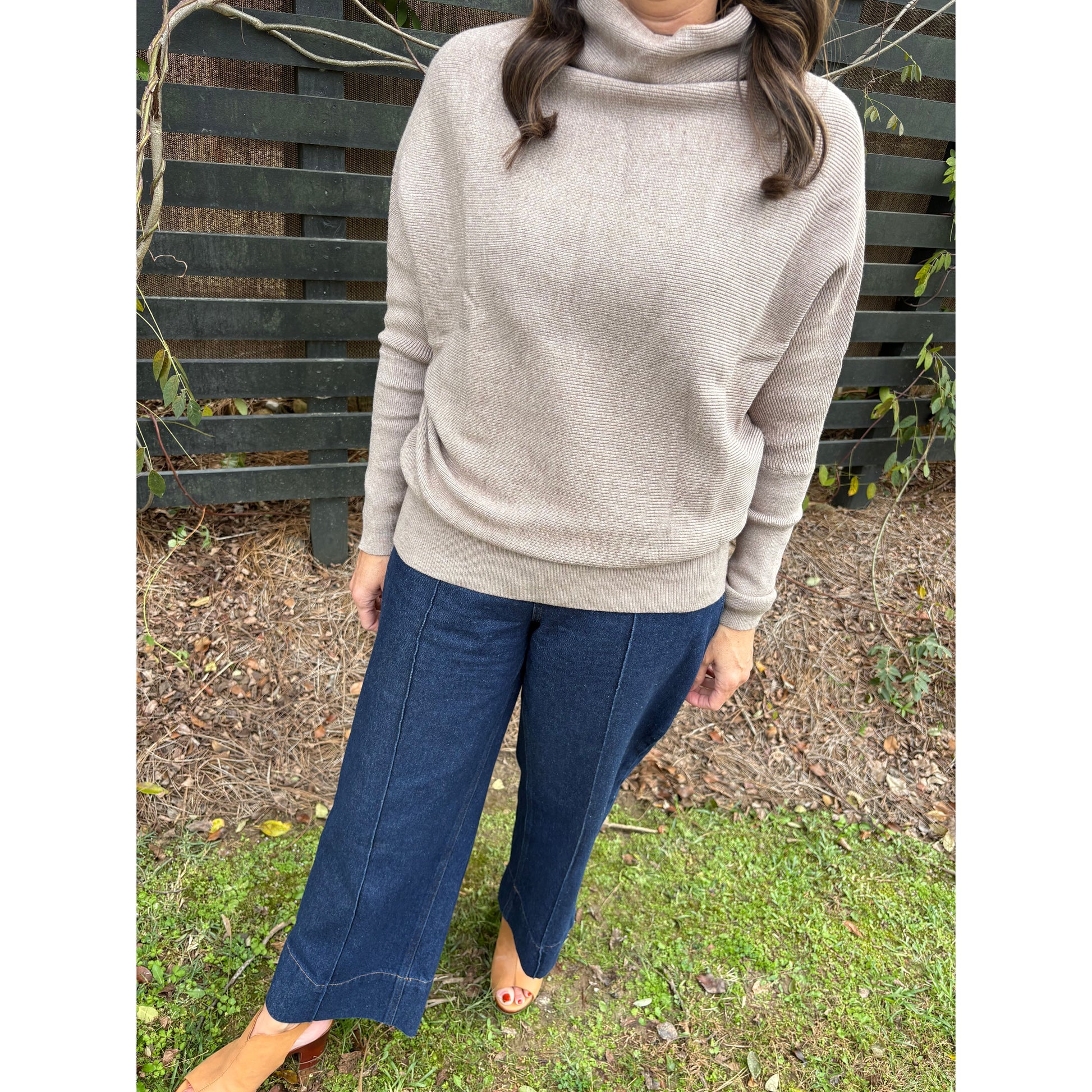 Our Sloane Sweater - Latte is a chic and cozy dolman sleeved sweater, perfect for a polished yet comfortable look. It features a stylish, wide funnel neck that drapes elegantly around the neckline. The sweater is designed with a relaxed, oversized fit and distinctive dolman sleeves that are full through the body and taper into long, fitted cuffs. Crafted from a soft, fine gauge ribbed knit with a horizontal texture, this piece offers both warmth and a modern, sophisticated silhouette.