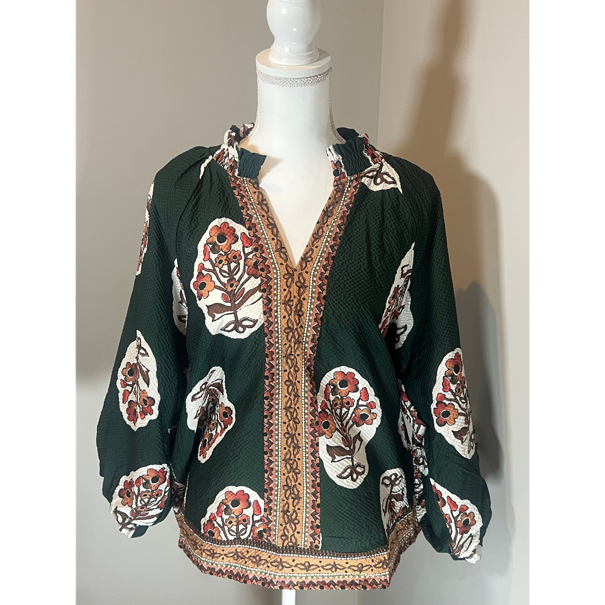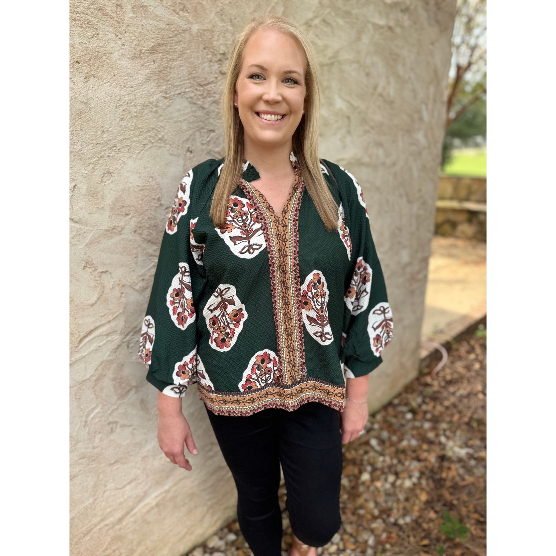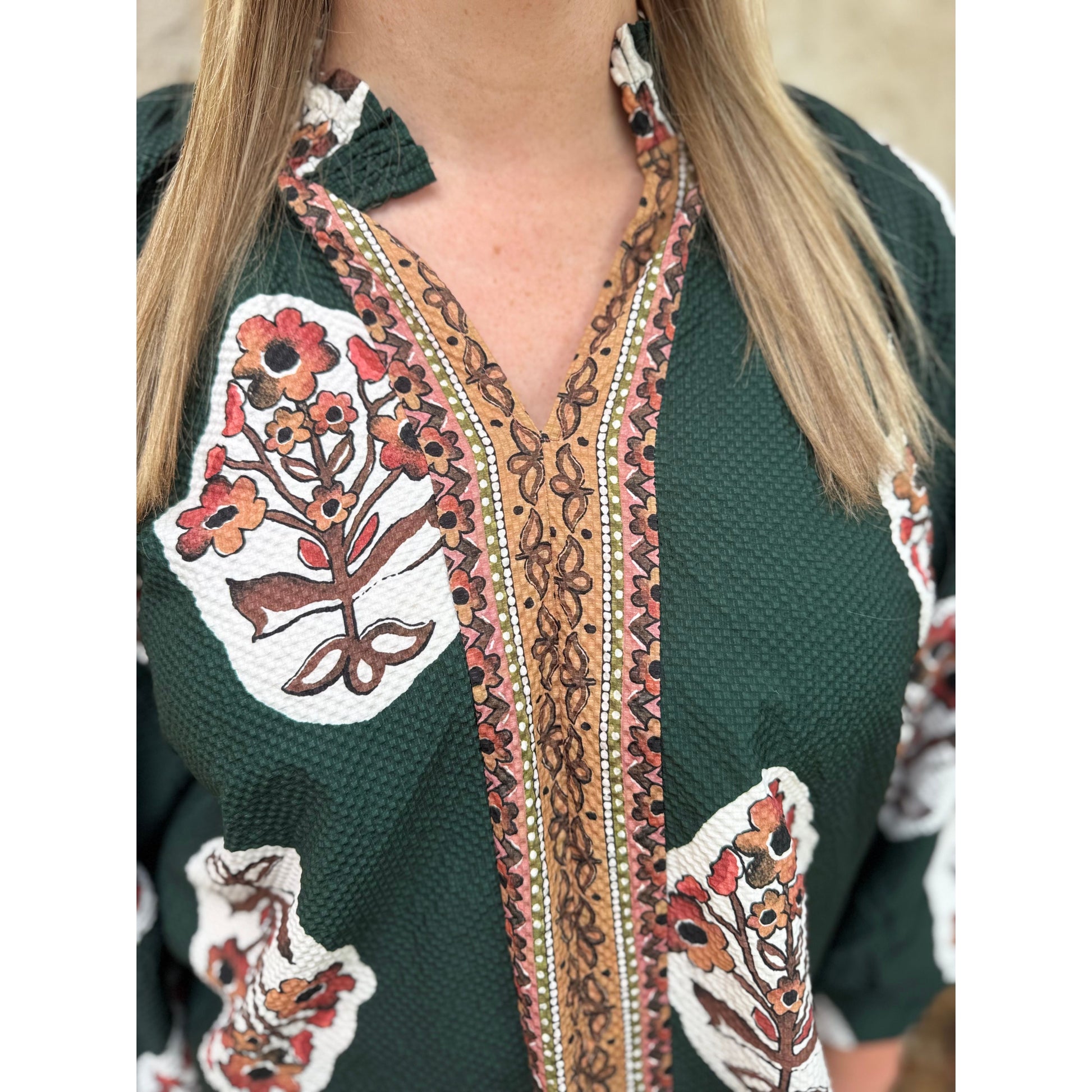 Featuring a split V-neck, our Curvy Zoey Top has flowing three-quarter sleeves. It includes a straight hem accentuated by a contrasting border print, with additional border detailing along the placket and hem. The garment is unlined for a lightweight feel.