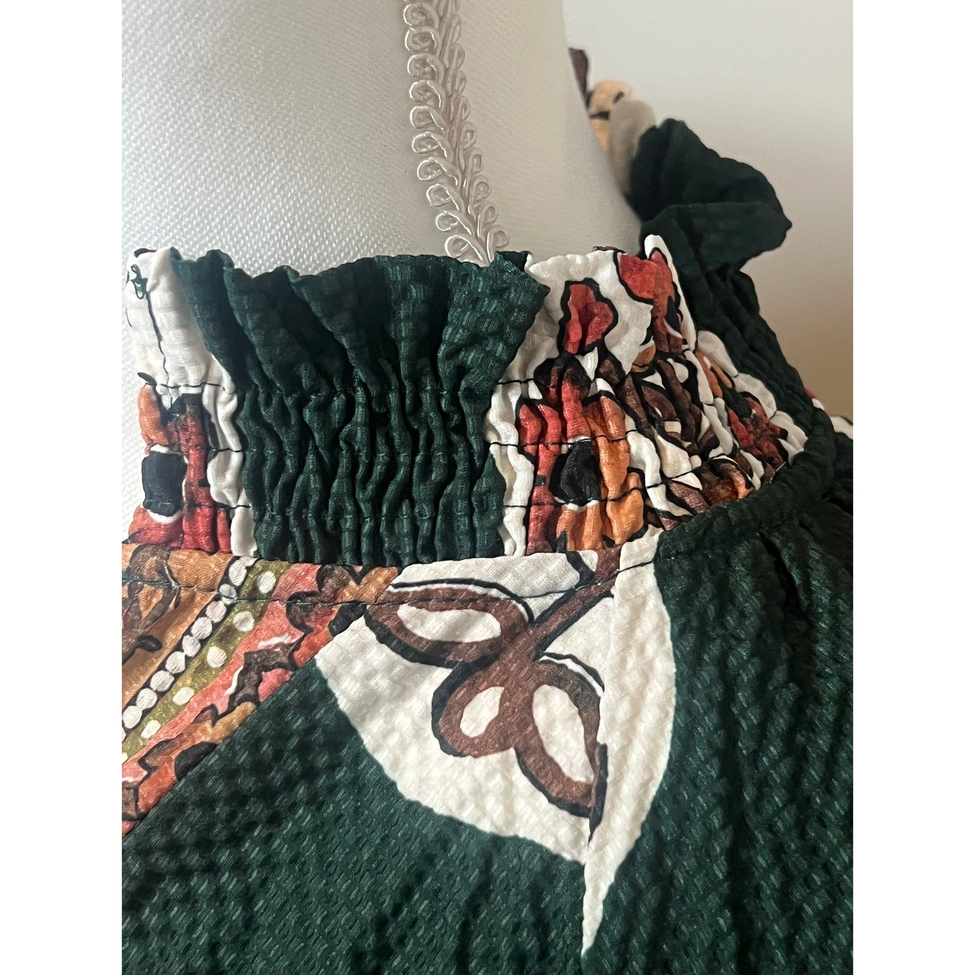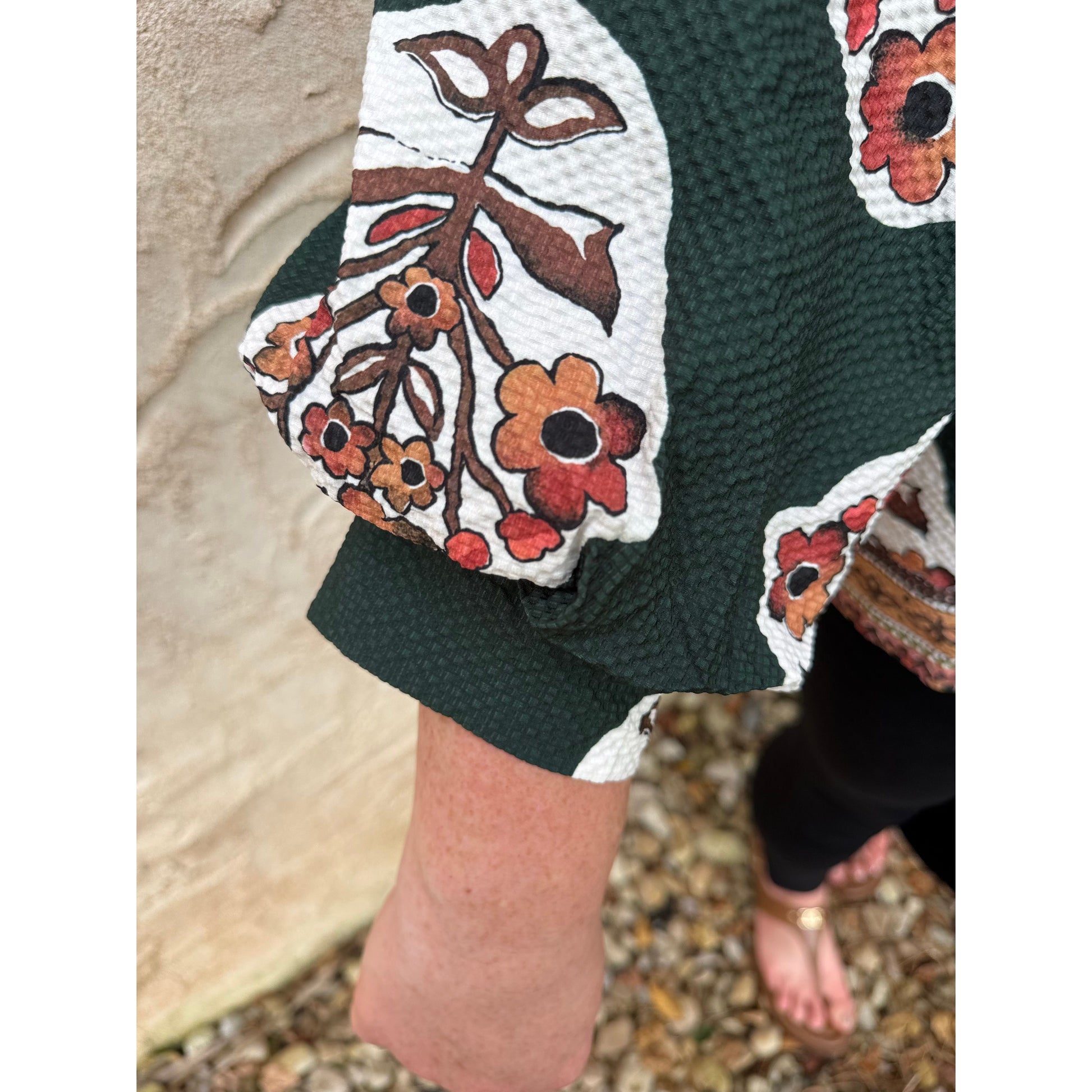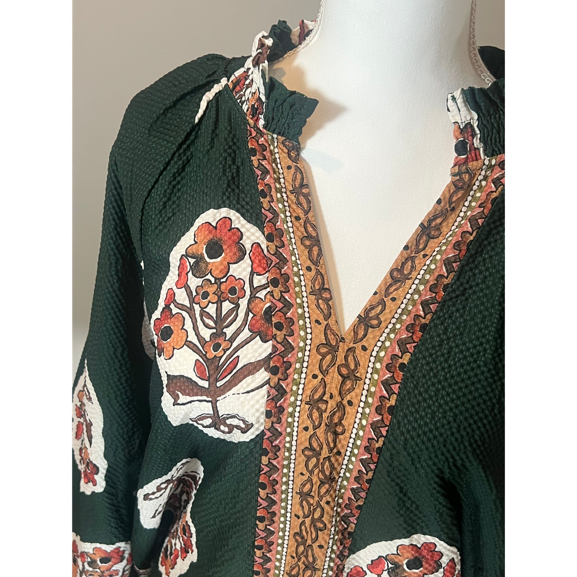 Featuring a split V-neck, our Curvy Zoey Top has flowing three-quarter sleeves. It includes a straight hem accentuated by a contrasting border print, with additional border detailing along the placket and hem. The garment is unlined for a lightweight feel.